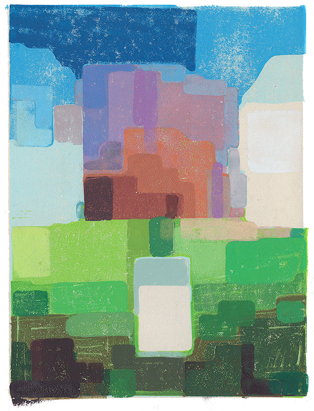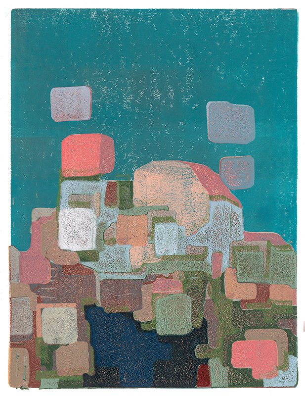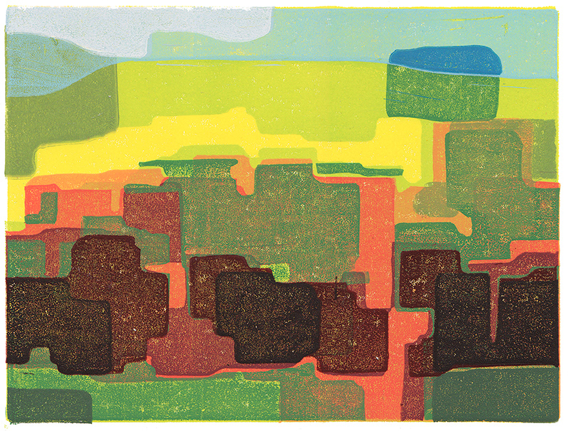 Three woodblock prints for a gallery show titled "Around Here, Out There" at Lilify in Monterey, California. Each print explores my local environment and my physical presence in it.